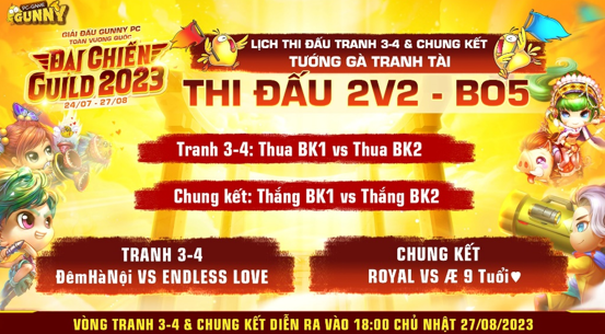 GG xin công bố lịch thi đấu Vòng Tranh 3-4 & Chung Kết Đại Chiến Guild 2023 với thể thức thi đấu 2v2 - BO5 loại trực tiếp sẽ diễn ra vào 18:00 Chủ Nhật 27/08/2023 được phát sóng trực tiếp tại Fanpage Gunny PC.