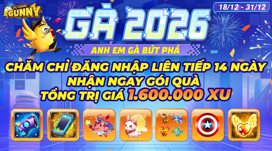 - Từ 18/12 - 31/12, Gunner đăng nhập Gà 2026 liên tục đăng nhập 3, 5, 7, 10, 14 ngày sẽ nhận thêm thưởng siêu đặc biệt.
