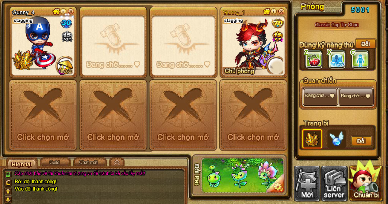 Người chơi tham gia có thể đổi trang bị, kỹ năng phụ trợ (Z/X/C) và sắp xếp đội hình trước khi bắt đầu.