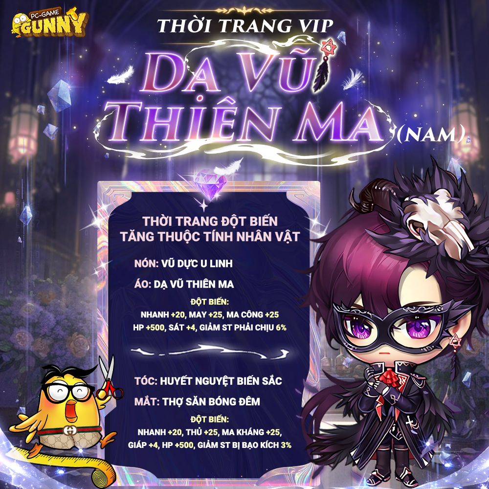 Dạ Vũ Thiên Ma (1) | Hiệu quả: Nhanh +20, May +25, Ma Công +25, Sát +4, HP +500, giảm sát thương phải chịu 6%. | Áo: Dạ Vũ Thiên Ma (Nam) | Kết hợp với Nón Vũ Dực U Linh nhận Hiệu quả: Nhanh +20, May +25, Ma Công +25, Sát +4, HP +500, giảm sát thương phải chịu 6% |