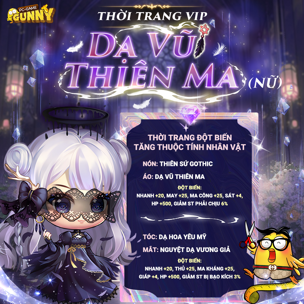 Nón: Thiên Sứ Gothic | Kết hợp với Áo Dạ Vũ Thiên Ma (Nữ) nhận Hiệu quả: Nhanh +20, May +25, Ma Công +25, Sát +4, HP +500, giảm sát thương phải chịu 6%. | ||